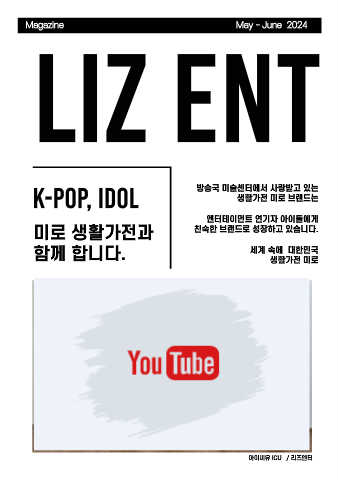 Magazine May - June 2024 LIZ ENT K-POP, IDOL 방송국 미술센터에서 사랑받고 있는 생활가전 미로 브랜드는 엔터테이먼트 연기자 아이돌에게 미로 생활가전과 친숙한 브랜드로 성장하고 있습니다. 함께 합니다. 세계 속에 대한민국 생활가전 미로 아이씨유 ICU / 리즈엔터